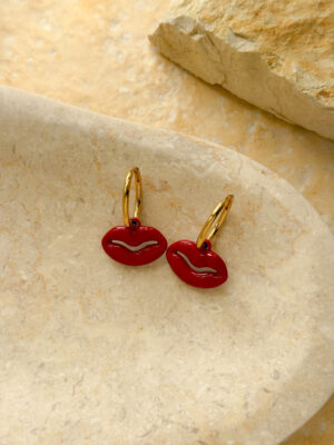 •Σκουλαρίκια ατσάλινα με επιχρυσωμένο κρίκο και Χείλη με Κόκκινο Σμάλτο