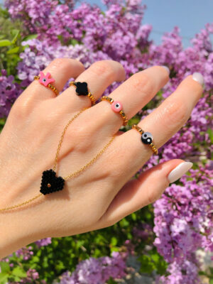Δαχτυλίδι Yin & Yang (Δείκτης) ,Δαχτυλίδι με Ροζ ματάκι (Μέσος) ,Δαχτυλίδι με στρογγυλεμένο σταυρό όνυχα (Παράμεσος) ,Δαχτυλίδι με Ροζ κορώνα (Μικρός) |