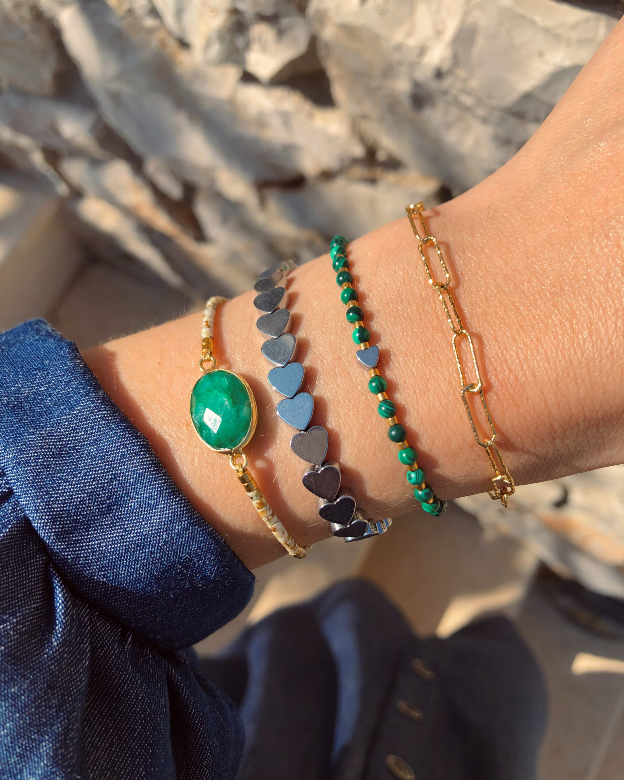 • Αποτελείται από υψηλής ποιότητας χρυσές ιαπωνικές χάντρες και πέτρες από μαλαχίτη σε χρώμα πράσινο