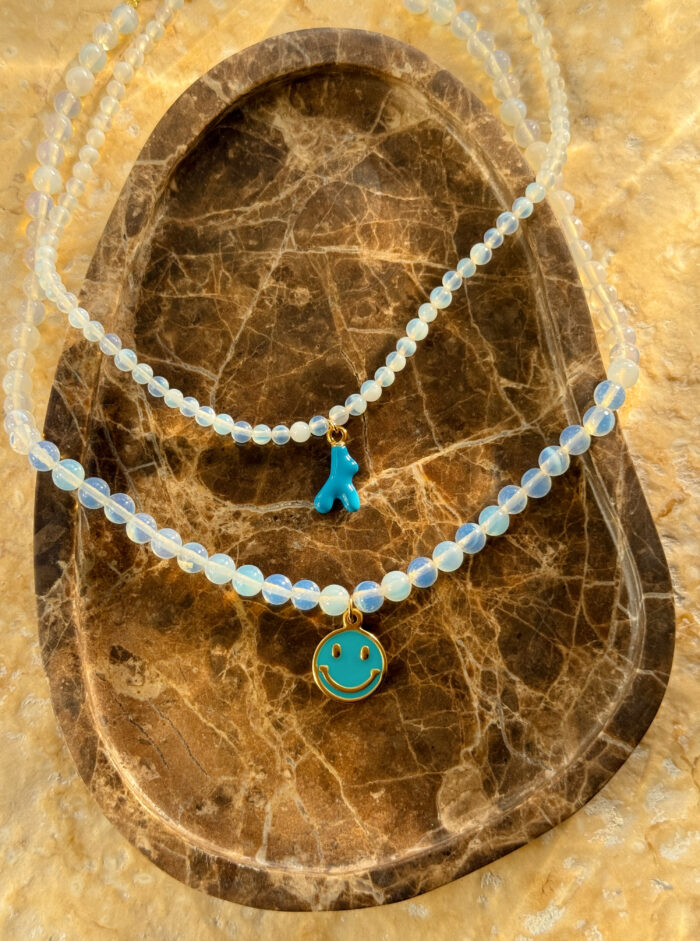 Κολιέ με Φεγγαρόπετρα και ατσάλινο στοιχείο με τιρκουάζ χαμογελαστή φατσούλα ,Κολιέ με Φεγγαρόπετρα και ατσάλινο στοιχείο με τιρκουάζ κοράλλι |